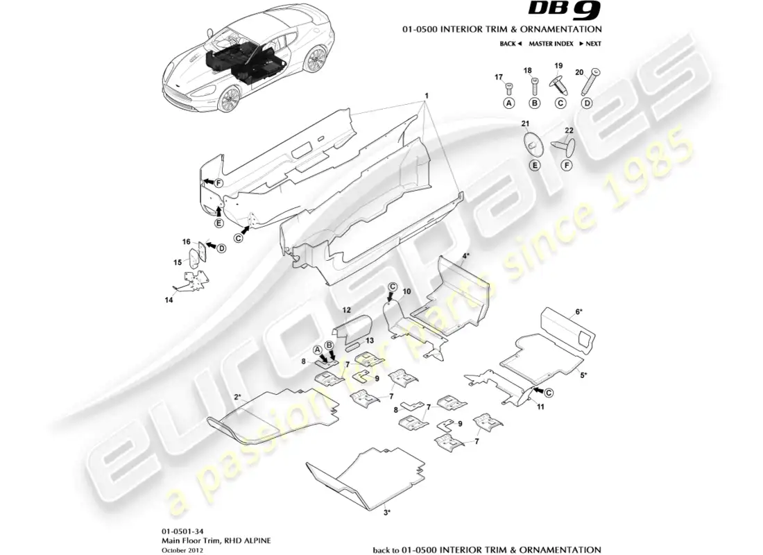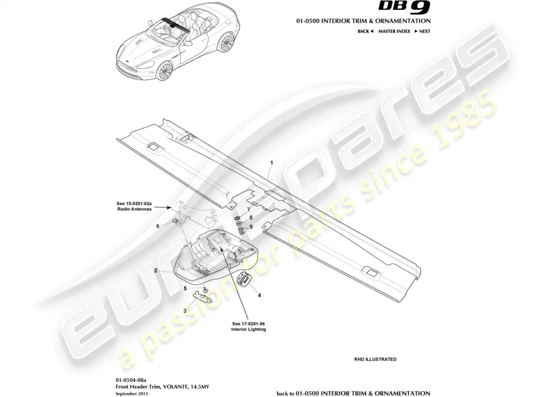 aston martin db9 (2013) montaje del techo interior diagrama de piezas